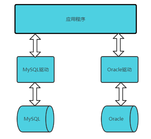 这里的驱动的概念和平时听到的那种驱动的概念是一样的,比如平时购买的声卡,网卡直接插到计算机上面是不能用的,必须要安装相应的驱动程序之后才能够使用声卡和网卡,同样道理,我们安装好数据库之后,我们的应用程序也是不能直接使用数据库的,必须要通过相应的数据库驱动程序,通过驱动程 序去和数据库打交道,如下所示: