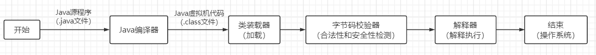 - 接着编译后的代码通过类装载器进行装载,然后字节码校验器对其进行校验,如果校验无误,则由解释器将其转换为“01”型代码,最后传送到操作系统平台上进行代码的正式执行。