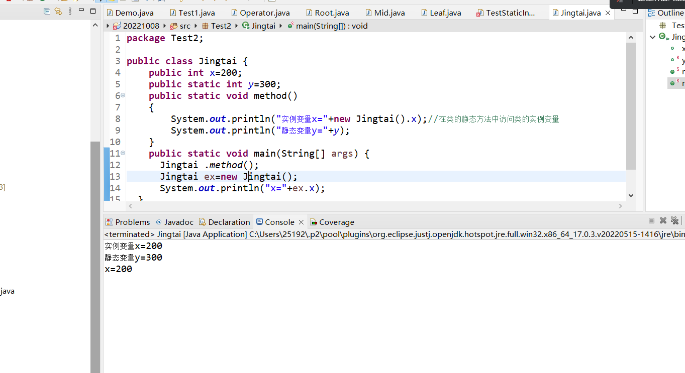 public int x=200; public static int y=300; public static void method() { System.out.println("实例变量x="+new jingtai().x);//在类的静态方法中访问类的实例变量 System.out.println("静态变量y="+y); } public static void main(String[] args) { jingtai .method(); jingtai ex=new jingtai(); System.out.println("x="+ex.x); }}