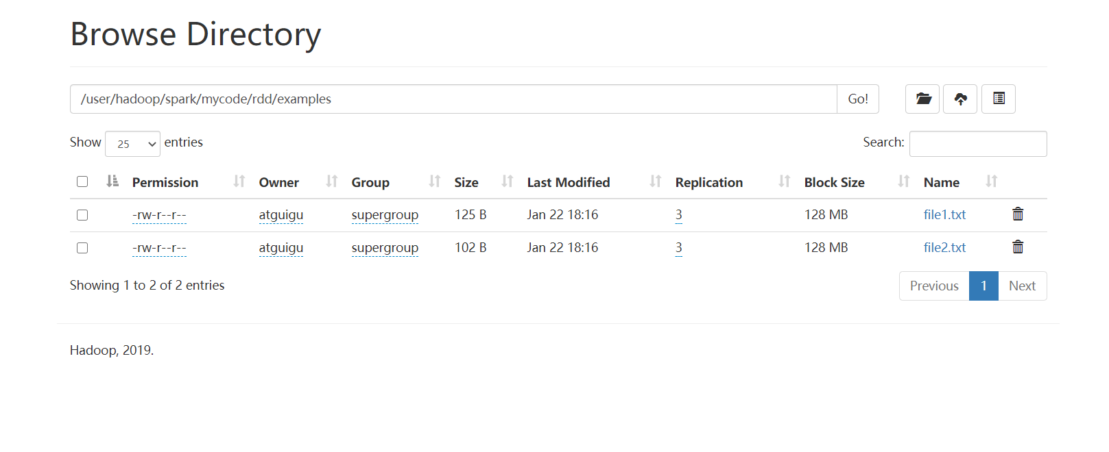 [atguigu@hadoop102 bin]$ hdfs dfs -ls /user/hadoop/spark/mycode/rdd/examples Found 2 items -rw-r--r-- 3 atguigu supergroup 125 2024-01-22 18:16 /user/hadoop/spark/mycode/rdd/examples/file1.txt -rw-r--r-- 3 atguigu supergroup 102 2024-01-22 18:16 /user/hadoop/spark/mycode/rdd/examples/file2.txt