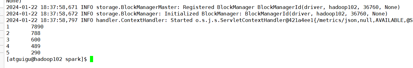 [atguigu@hadoop102 spark]$ ./bin/spark-submit --class "TopN" /usr/local/spark/mycode/topscala/target/scala-2.12/simple-project_2.12-1.0.jar