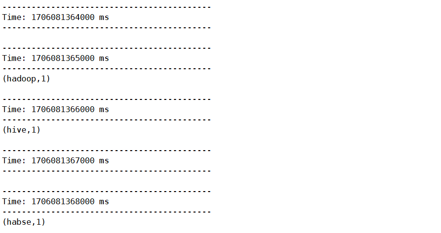 .... ------------------------------------------- Time: 1706014916000 ms ------------------------------------------- (HIVE,1) (SPARK,1) (HADOOP,1) (HBASE,1) .....