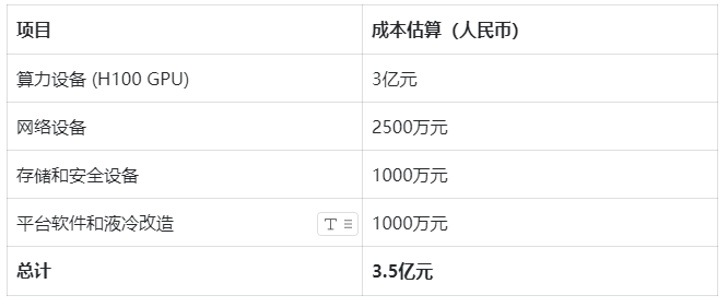 自建智能算力中心虽然能够提供稳定的计算资源,但企业需要承担高昂的硬件投入和长期的运维成本。以建设一个由英伟达H100 GPU构成的千卡集群智算中心为例,前期投入成本预计如下: