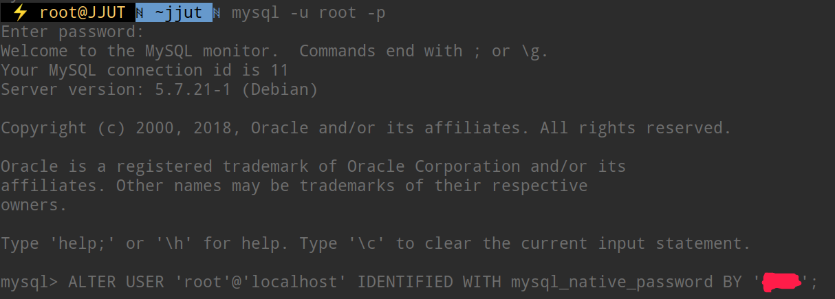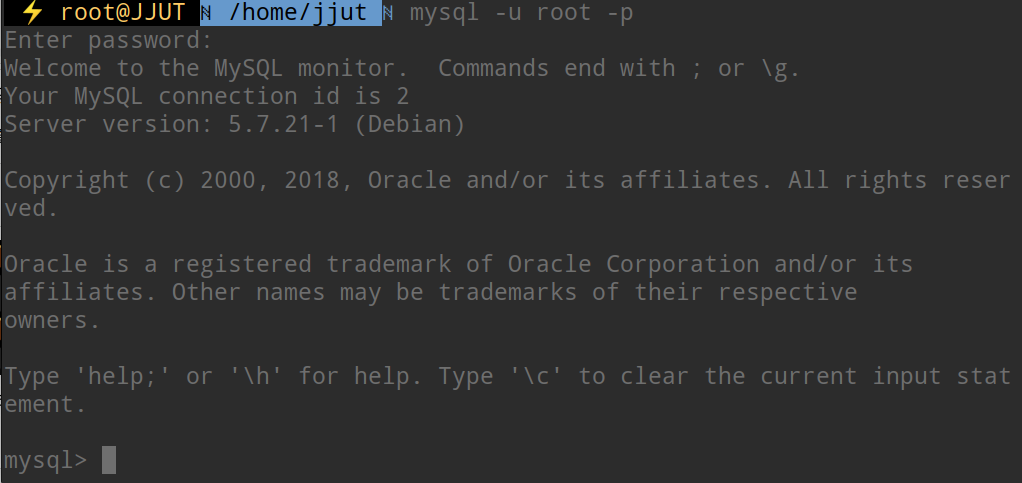 -u 表示选择登陆的用户名, -p 表示登陆的用户密码,上面命令输入之后会提示输入密码,此时输入密码,然后就登陆到了数据库: