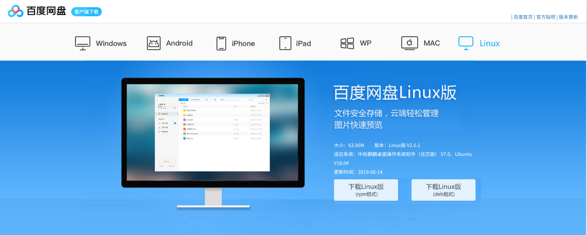 6月15日,百度悄无声息的放出了百度云网盘的Linux版本,版本号为V2.0.1,提供了适应中标麒麟桌面操作系统(兆芯版)和Ubuntu发行版本。