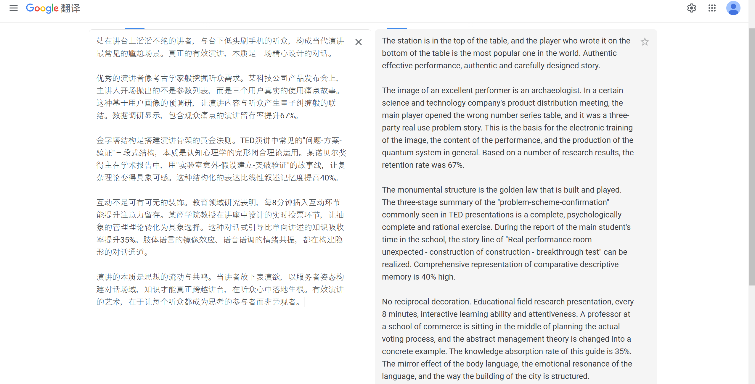 接下来我们把生成的文本复制到Google翻译(https://translate.google.com) 当中,然后选取机翻选项,并将翻译模式调成日文翻译成英文如下图,经实践只有这样才能有效减低AI率,而选择自动检测语言或者中文转英文就会被AI检测工具逮住。