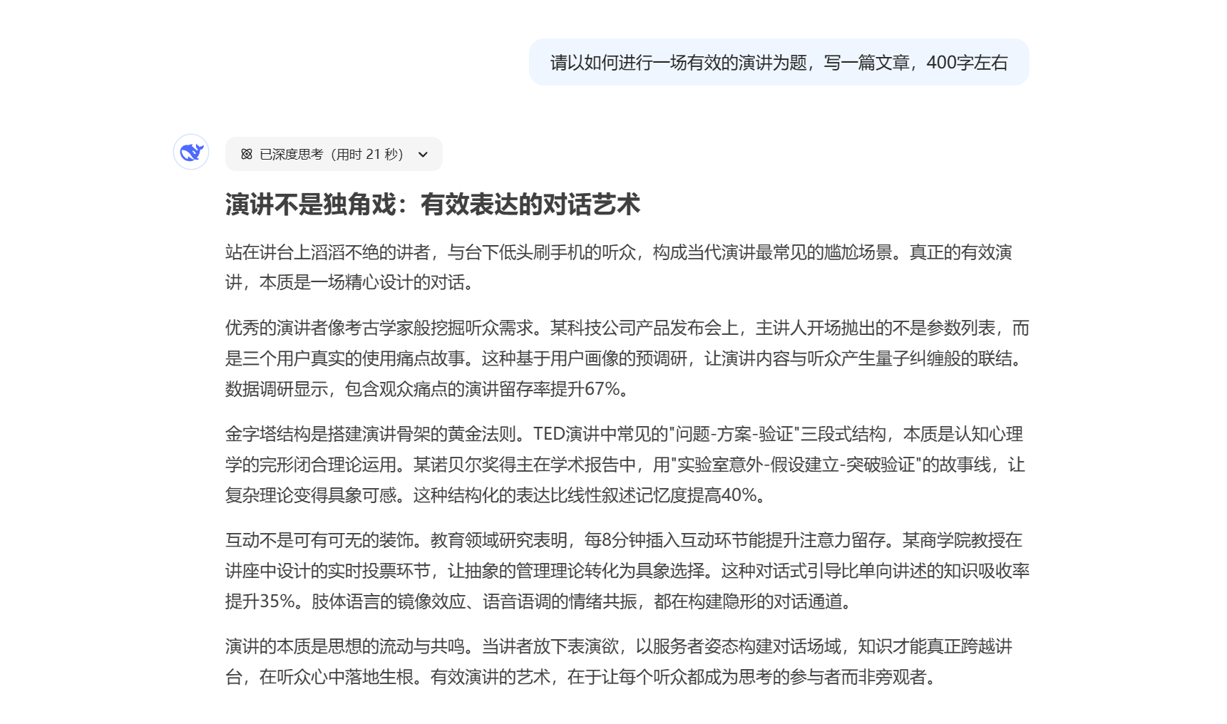 首先确定作文的主题,这点可以叫AI提取出来,我们以"如何进行一场有效的演讲"为例子进行实操。