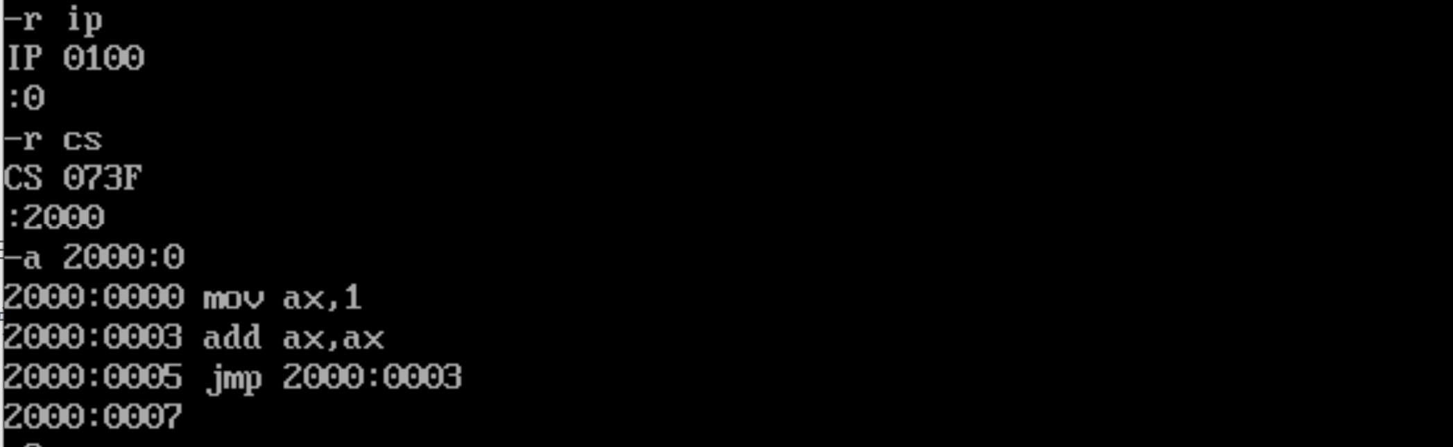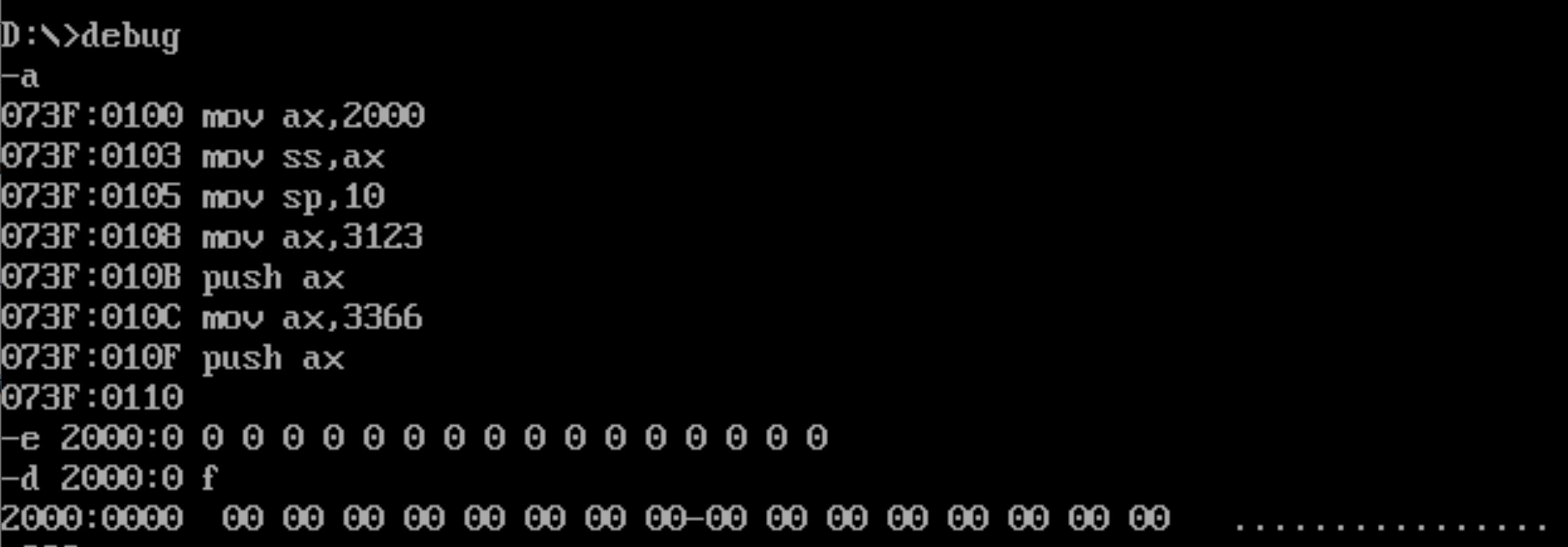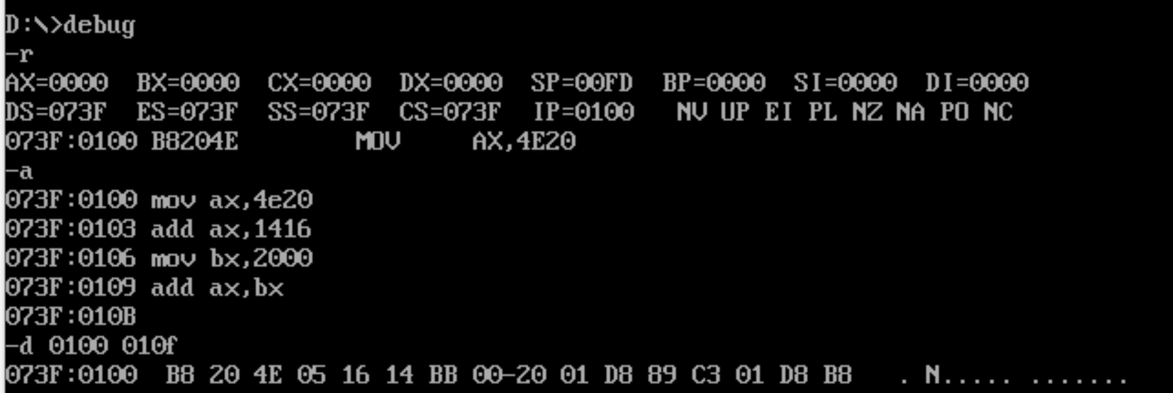 先用a命令输入的 7 行指令,使用 e 命令修改 2000:0~2000:f 的值,及查看修改后的部分
