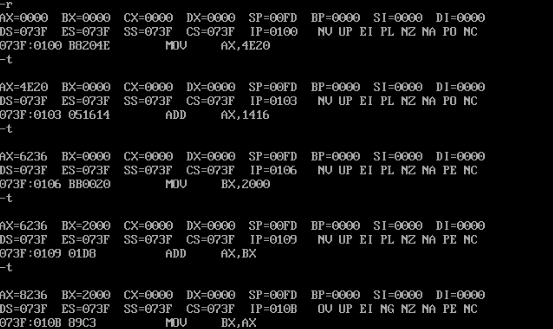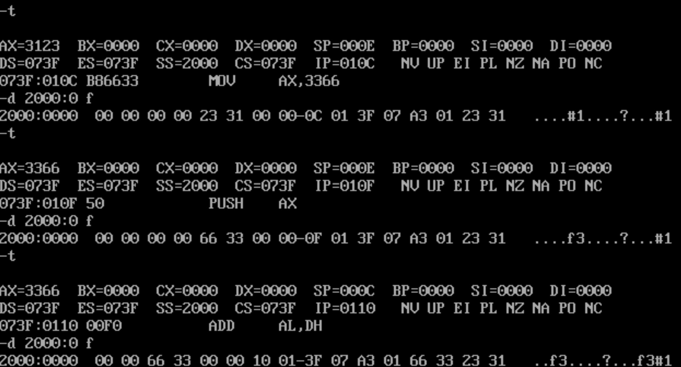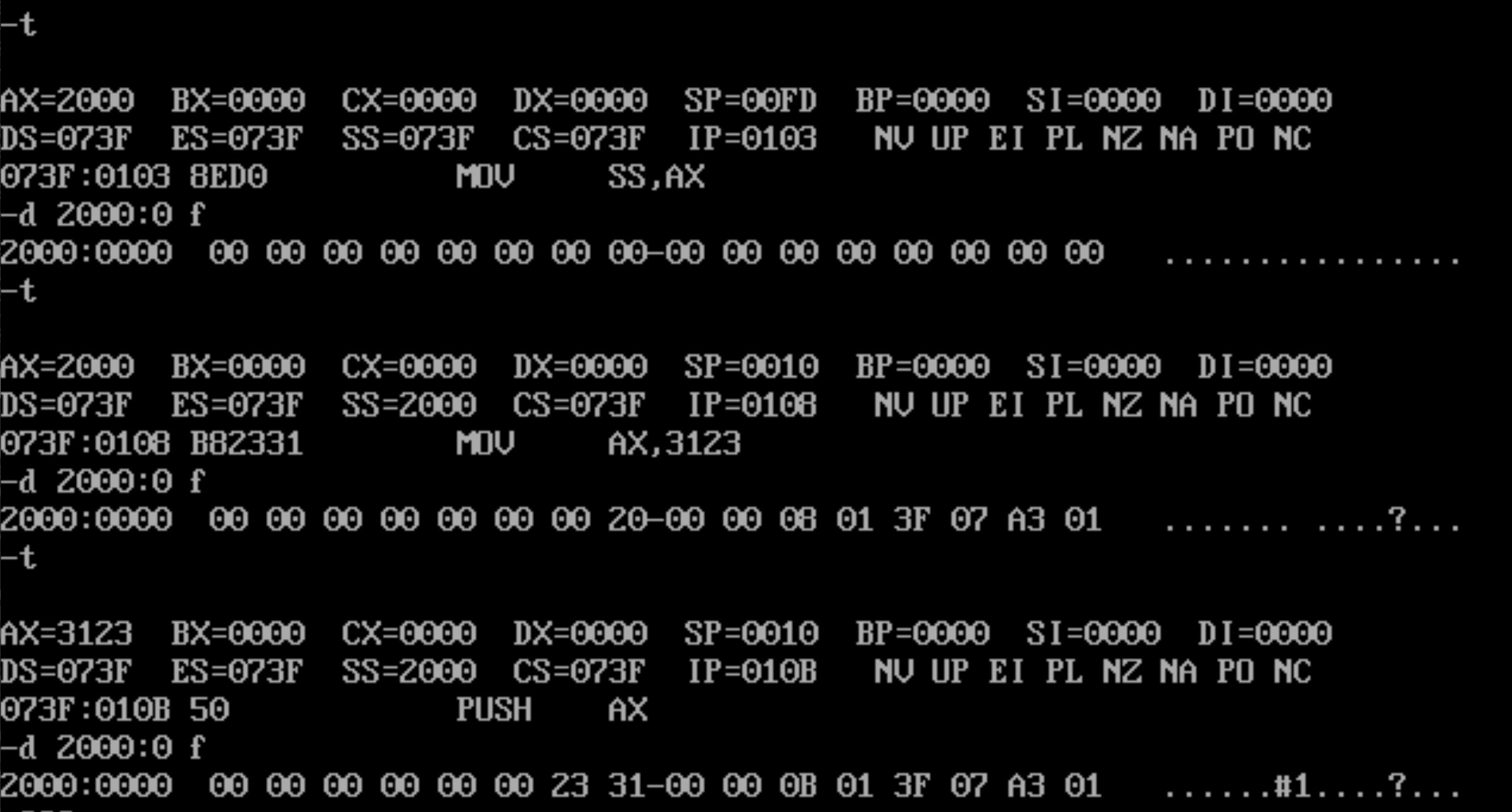 然后单步调试每一行汇编指令的截图。每一条指令单步调试后,都使用 d 命令查看2000:0~2000:f 的值