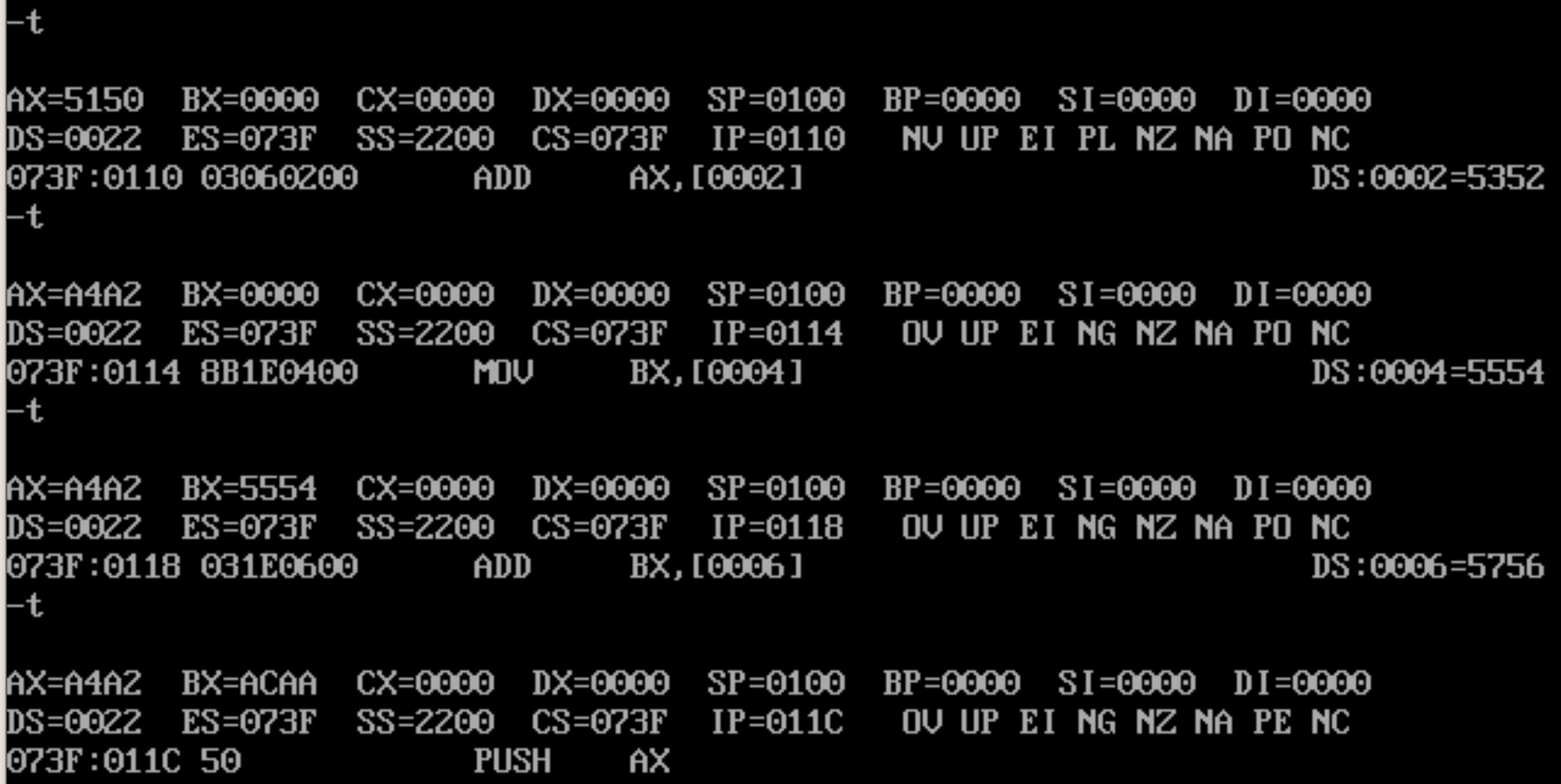 首先展示前四步单步调试,这里一共进行了5个命令的操作,因为在第四步的mov ss后的下一条指令被立刻执行了,这里与中断机制有关