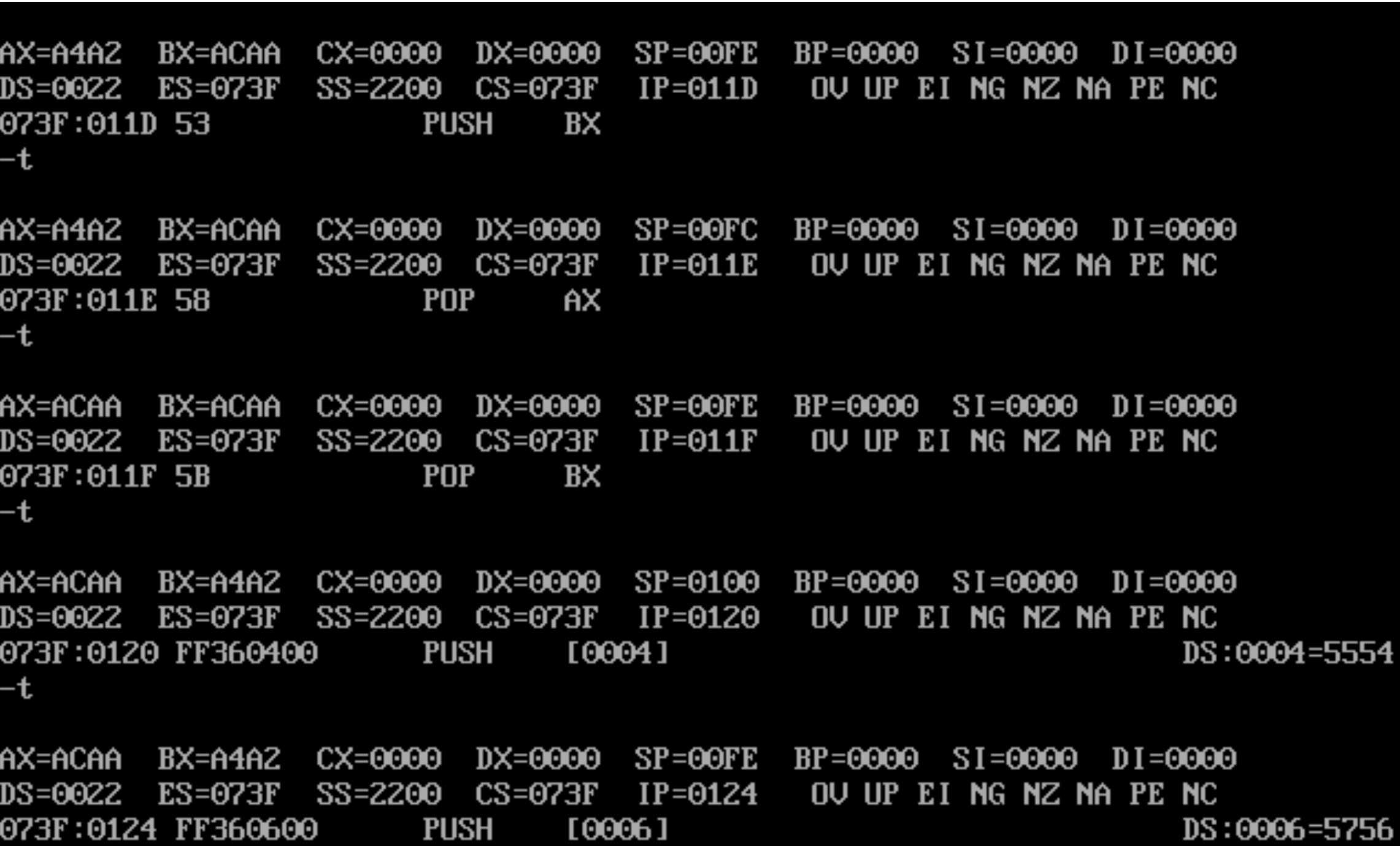 pop ax ;sp = 00FE; ax = acaa