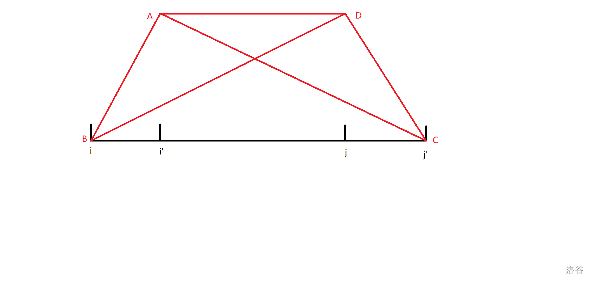 我们把 \(i'\) 和 \(j'\) 提到一个更高的水平线上,再把每条线拉直,此时我们就能得到一个梯形: