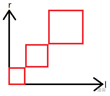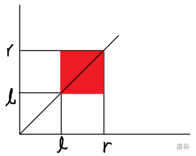 (其实子区间 \([l', r']\) 需要满足 \(r' \geq l'\),也就是图中斜线上半部分的区域,但是 \(r' \leq l'\) 时,它产生的贡献一定为 \(0\),因此我们可以将其补成一个完整的矩形)。