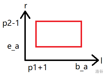 我们考虑,对于一个数字 \(a\),什么样的操作可以使这个序列中不存在 \(a\)。如果原序列中有 \(a\),那么我们需要将这些 \(a\) 全部变成 \(a + 1\)。假设 \(a\) 出现的第一个位置是 \(b_a\),最后一个位置是 \(e_a\),那么首先一定要满足 \(l \leq b_a \leq e_a \leq r\)。但是,如果这个区间中包含了 \(a - 1\),那么我们会把它加成 \(1\),这是不可以的。因此,如果 \([b_a], e_a\) 中有 \(a - 1\),那么 \(a\) 一定会造成贡献。否则假设 \(b_a\) 之前第一个 \(a - 1\) 出现的位置是 \(p_1\),\(e_a\) 之后第一个 \(a - 1\) 出现的位置是 \(p_2\),那么 \(l, r\) 就需要满足 \(p_1 + 1 \leq l \leq b_a\),\(e_a \leq r \leq p_2 - 1\)。画到平面上就是这样一个矩形: