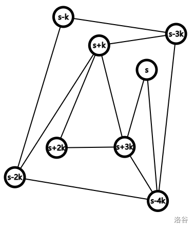 接下来,我们把所有 \(\bmod ~k\) 同余的点拉出来放在一个序列上,然后我们考虑每一个点 \(s\)。如果 \(t(t > s)\) 这个点的点权最终能变成 \(s\),那么首先,\(t\) 必须和 \(s\) 连通,其次, \(t\) 必然经历了 \(t \rightarrow t - k \rightarrow t - 2 \times k \rightarrow \dots \rightarrow s\) 的过程,因此 \(s + k\) 必须存在在 \(s\) 处在的连通块中,\(s + 2 \times k\) 必须与 \(s\) 或 \(s + k\) 连边,\(s + 3 \times k\) 必须与 \(s + 2 \times k\)、\(s + k\) 或 \(s\) 连边,以此类推。一旦有一个 \(s + m \times k\) 没有与 \([s, s + (m - 1) \times k]\) 连边,那么比它大的点也就无法通过它作为跳板继续变小了。因此,最终点权能变成 \(s\) 的点必然是一段区间 \([l, r]\),而根据我们刚才的推导,\([l, r]\) 应该满足以下性质: