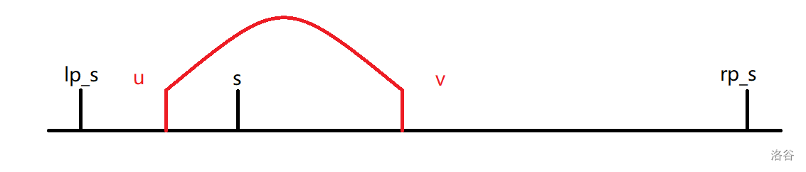 我们考虑一条边 \((u, v)\) 会连接哪几个区间,如果 \((u, v)\) 连接了 \([lp_i, s)\) 和 \((s, rp_i]\),那么一定是如下的情况: