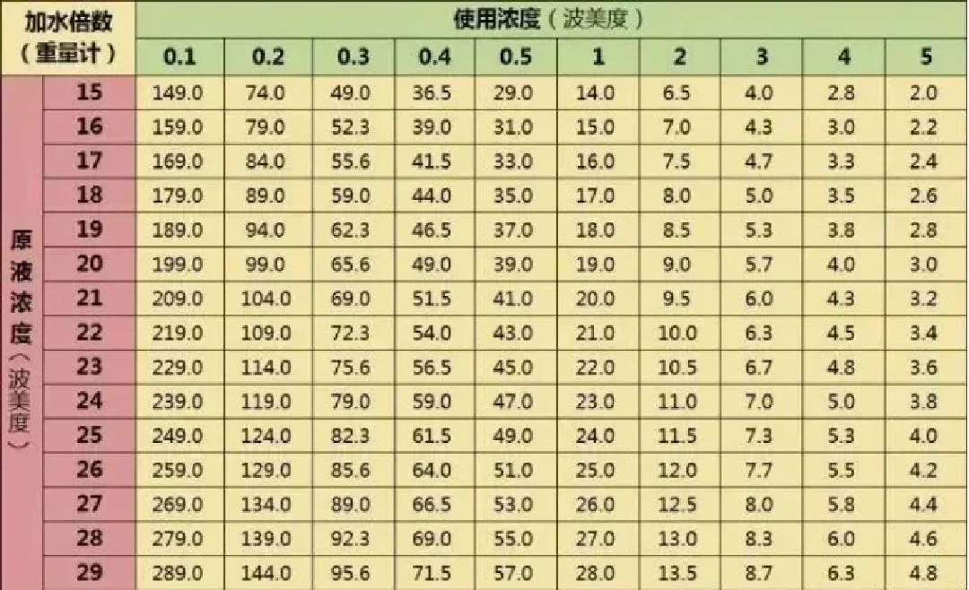 例如:你买的石硫合剂原液是29波美度,想要配1波美度去消杀,表格29/1的交汇点是28,就是说每升原液➕28升水就可以了。