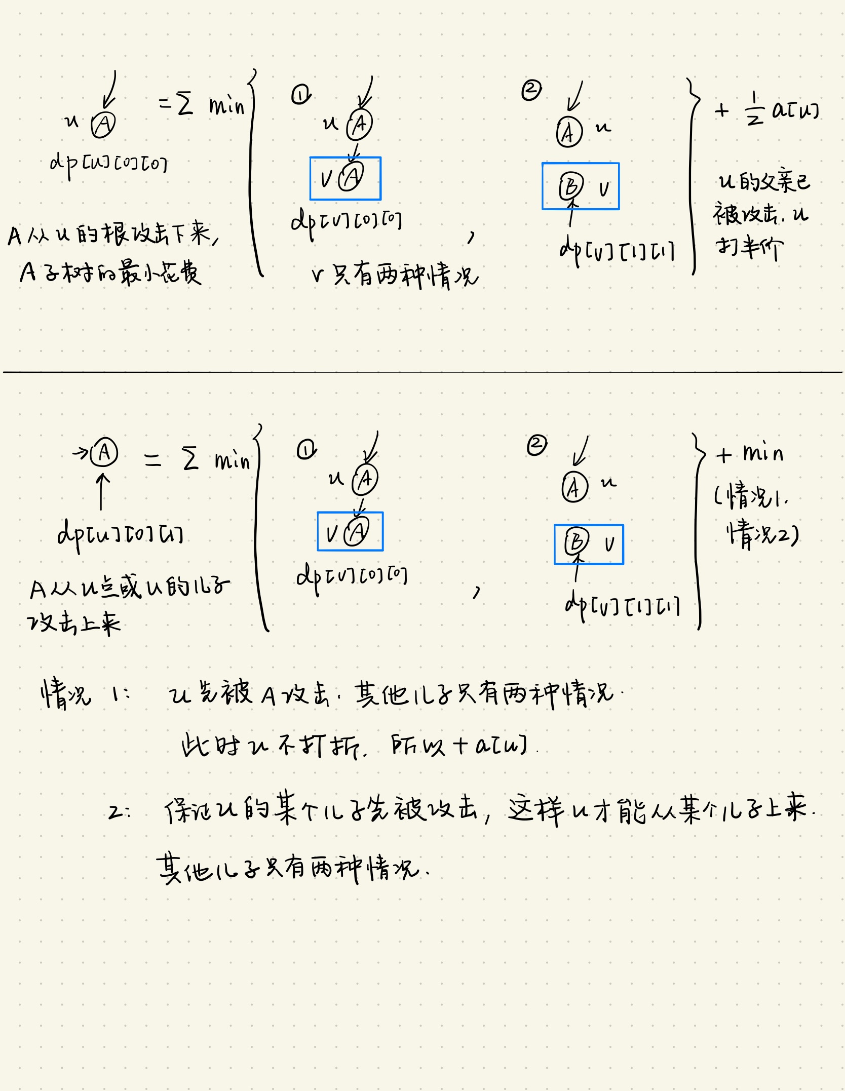 dp[i][0..1][0..1]分别对应i为根的子树上面四种状态下攻击整个子树的最小代价。