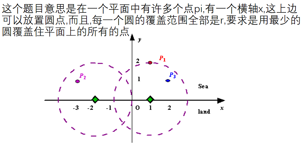 题目要让圆覆盖住某个点pi,又因为虽然pi点的x,y变化很多,但是圆点的y轴是固定不变的,因此我就可以求出满足覆盖pi点的坐标的圆点坐标上下界,我们可以对每一个都进行这种处理--因此题目就变成了用最少的点覆盖所有的pi区间范围