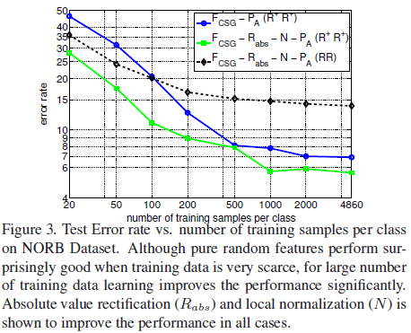 在数据集比较少的时候随机filter结果很好,由于在使用abs和归一化情况下,随机filter的理想输入和学习到的filter的理想输入很相似;在好的结构下(使用abs和归一化)监督学习网络产生了很好的识别准确率;最后无监督学习+监督微调产生了最好的分类识别率。