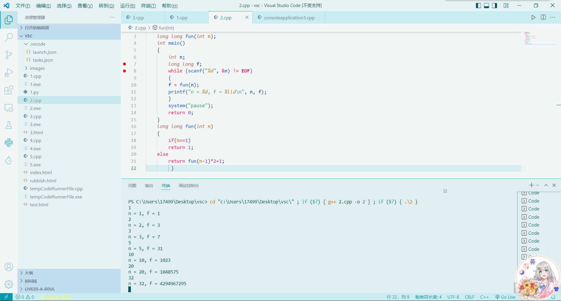 return hanoi(n - 1, a, c, b) + 1 + hanoi(n - 1, b, a, c);