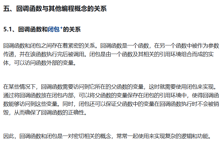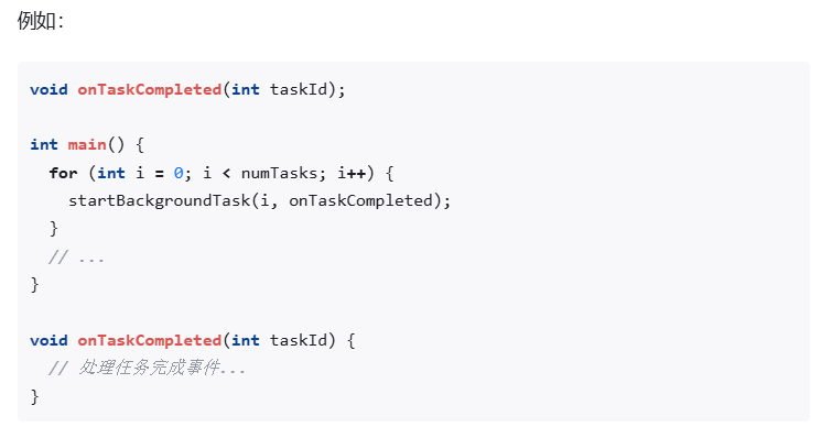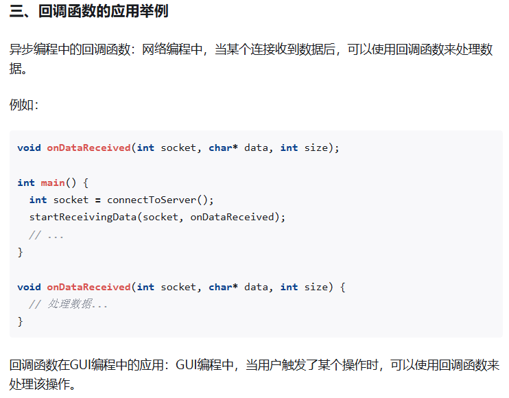回调函数是一种特殊的函数,它作为参数传递给另一个函数,并在被调用函数执行完毕后被调用。回调函数通常用于事件处理、异步编程和处理各种操作系统和框架的API。