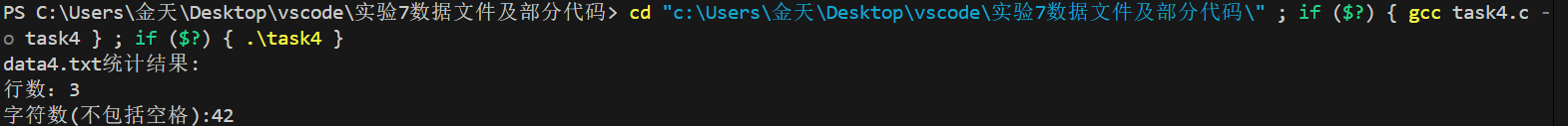 1 #include <stdio.h> 2 int hangshu(); 3 int zifushu(); 4 int main() { 5 printf("data4.txt统计结果:\n"); 6 printf("行数:%d\n",hangshu()); 7 printf("字符数(不包括空格):%d\n",zifushu()); 8 return 0; 9 } 10 int hangshu() { 11 FILE *fp; 12 fp = fopen("C:/Users/金天/Desktop/vscode/实验7数据文件及部分代码/data4.txt","r"); 13 if(!fp) { 14 printf("文件打开失败!\n"); 15 return 0; 16 } 17 int count = 0; 18 char ch; 19 while ((ch = getc(fp))!= EOF) { 20 if (ch == '\n') { 21 count++; 22 } 23 } 24 fclose(fp); 25 return count+=1; 26 } 27 int zifushu() { 28 FILE *fp; 29 fp = fopen("C:/Users/金天/Desktop/vscode/实验7数据文件及部分代码/data4.txt","r"); 30 if(!fp) { 31 printf("文件打开失败!\n"); 32 return 0; 33 } 34 int count = 0; 35 char ch; 36 while ((ch = getc(fp))!= EOF) { 37 if (ch!=' '&&ch!='\n') { 38 count++; 39 } 40 } 41 fclose(fp); 42 return count; 43 }