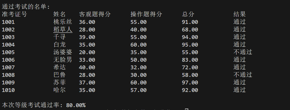 1 #include <stdio.h> 2 #include <string.h> 3 4 #define N 10 5 6 typedef struct { 7 long id; // 准考证号 8 char name[20]; // 姓名 9 float objective; // 客观题得分 10 float subjective; // 操作题得分 11 float sum; // 总分 12 char result[10]; // 考试结果 13 } STU; 14 15 // 函数声明 16 void read(STU st[], int n); 17 void write(STU st[], int n); 18 void output(STU st[], int n); 19 int process(STU st[], int n, STU st_pass[]); 20 21 int main() { 22 STU stu[N], stu_pass[N]; 23 int cnt; 24 double pass_rate; 25 26 printf("从文件读入%d个考生信息...\n", N); 27 read(stu, N); 28 29 printf("\n对考生成绩进行统计...\n"); 30 cnt = process(stu, N, stu_pass); 31 32 printf("\n通过考试的名单:\n"); 33 output(stu, N); // 输出所有考生完整信息到屏幕 34 write(stu, N); // 输出考试通过的考生信息到文件 35 36 pass_rate = 1.0 * cnt / N; 37 printf("\n本次等级考试通过率: %.2f%%\n", pass_rate*100); 38 39 return 0; 40 } 41 42 // 把所有考生完整信息输出到屏幕上 43 // 准考证号,姓名,客观题得分,操作题得分,总分,结果 44 void output(STU st[], int n) { 45 int i; 46 47 printf("准考证号\t姓名\t客观题得分\t操作题得分\t总分\t\t结果\n"); 48 for (i = 0; i < n; i++) 49 printf("%ld\t\t%s\t%.2f\t\t%.2f\t\t%.2f\t\t%s\n", st[i].id, st[i].name, st[i].objective, st[i].subjective, st[i].sum, st[i].result); 50 } 51 52 // 从文本文件examinee.txt读入考生信息:准考证号,姓名,客观题得分,操作题得分 53 void read(STU st[], int n) { 54 int i; 55 FILE *fin; 56 57 fin = fopen("examinee.txt", "r"); 58 if (!fin) { 59 printf("fail to open file\n"); 60 return; 61 } 62 63 while (!feof(fin)) { 64 for (i = 0; i < n; i++) 65 fscanf(fin, "%ld %s %f %f", &st[i].id, st[i].name, &st[i].objective, &st[i].subjective); 66 } 67 68 fclose(fin); 69 } 70 71 // 把通过考试的考生完整信息写入文件list_pass.txt 72 // 准考证号,姓名,客观题得分,操作题得分,总分,结果 73 void write(STU st[], int n) { 74 int i, count = 0; 75 FILE*fp; 76 fp=fopen("list_pass.txt","w"); 77 if(fp==NULL) 78 { 79 printf("fail to open file\n"); 80 return; 81 } 82 for(i=0;i<n;i++) 83 { 84 if(st[i].sum>=60) 85 { 86 count++; 87 fprintf(fp,"%ld %s %.2f %.2f %.2f %s\n",st[i].id,st[i].name,st[i].objective,st[i].subjective,st[i].sum,st[i].result); 88 } 89 } 90 fclose(fp); 91 } 92 // 对考生信息进行处理:计算每位考生考试总分、结果;统计考试通过的人数 93 int process(STU st[], int n, STU st_pass[]) { 94 int i,count=0; 95 for (i = 0; i < n; i++) { 96 st[i].sum = st[i].objective + st[i].subjective; 97 if (st[i].sum >= 60) { 98 strcpy(st[i].result, "通过"); 99 count++; 100 st_pass[count-1]=st[i]; 101 } else { 102 strcpy(st[i].result, "不通过"); 103 } 104 } 105 return count; 106 107 }