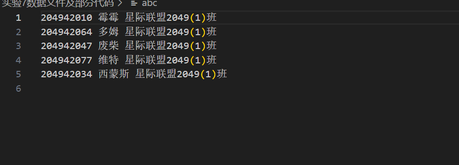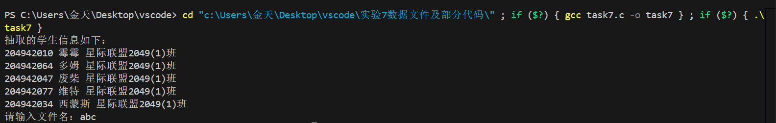 1 #include <stdio.h> 2 #include <time.h> 3 #include <stdlib.h> 4 5 struct student { 6 long long xuehao; 7 char name[12]; 8 char banji[24]; 9 }; 10 11 int main() { 12 FILE* fp; 13 struct student STU[80]; 14 int total_students = 0; 15 fp = fopen("list.txt", "r"); 16 if (fp == NULL) { 17 printf("文件打开失败!"); 18 return 0; 19 } 20 while (total_students < 80 && fscanf(fp, "%lld %s %s", &STU[total_students].xuehao, STU[total_students].name, STU[total_students].banji) != EOF) { 21 total_students++; 22 } 23 fclose(fp); 24 25 srand(time(NULL)); 26 int num[5]; 27 int count = 0; 28 struct student chu[5]; 29 while (count < 5) { 30 int temp = rand() % total_students; 31 int flag = 0; 32 for (int i = 0; i < count; i++) { 33 if (temp == num[i]) { 34 flag = 1; 35 break; 36 } 37 } 38 if (flag == 0) { 39 num[count] = temp; 40 chu[count] = STU[temp]; 41 count++; 42 } 43 } 44 45 printf("抽取的学生信息如下:\n"); 46 for (int i = 0; i < 5; i++) { 47 printf("%lld %s %s\n", chu[i].xuehao, chu[i].name, chu[i].banji); 48 } 49 50 char filename[100]; 51 printf("请输入文件名:"); 52 scanf("%99s", filename); 53 fp = fopen(filename, "w"); 54 if (fp == NULL) { 55 printf("文件打开失败!"); 56 return 0; 57 } 58 for (int i = 0; i < 5; i++) { 59 fprintf(fp, "%lld %s %s\n", chu[i].xuehao, chu[i].name, chu[i].banji); 60 } 61 fclose(fp); 62 return 0; 63 }