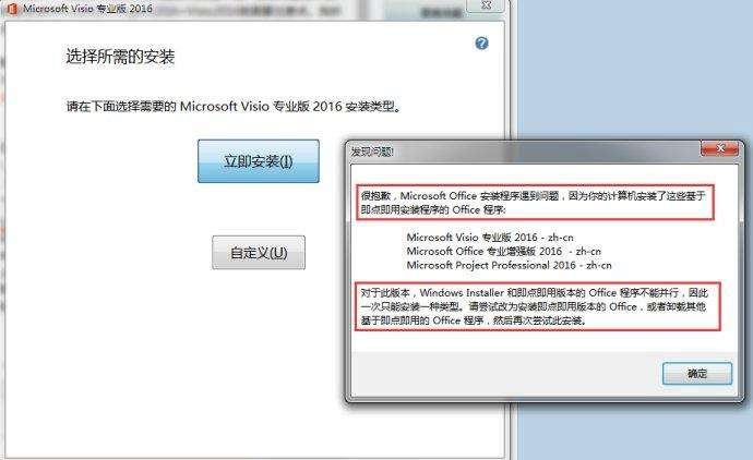 3、两种不同的安装方式。Office2016、Project2016、Visio2016分为即点即用(clickToRun)和Windows Installer这两种不同的安装方式,“即点即用”的office安装包,双击即可安装,中途无需任何干预,只要等待安装完成即可;“Windows Installer”安装包类似常规的windows程序安装,需要选择路径,选择安装哪些组件,再下一步。无论如何,只能坚定的使用其中一种安装方式,而不能混用,否则会出现装不上的情况。