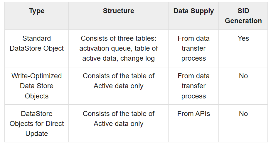 - 由于此DSO的结构包含一个用于存储活动数据的表,并且没有更改日志,因此不允许增量更新到InfoProvider。