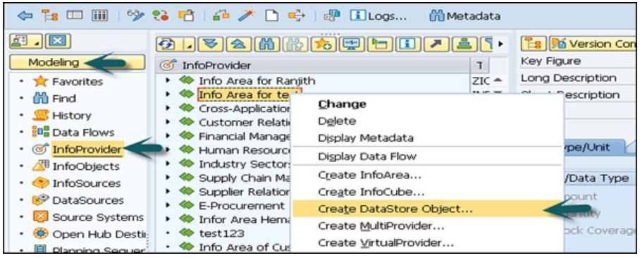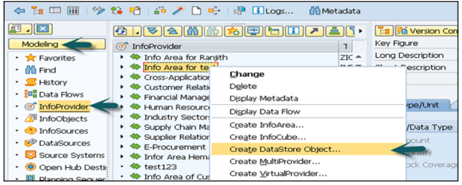 转到建模选项卡→信息提供者→选择信息区域→右键单击并单击创建数据存储对象。