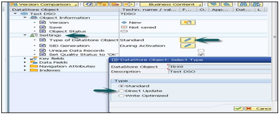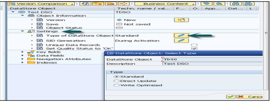 要更改DSO类型,请转到设置标签,如以下屏幕截图所示。 单击“编辑”图标,然后在打开的新窗口中,您可以更改数据存储对象,也可以选择“类型”。