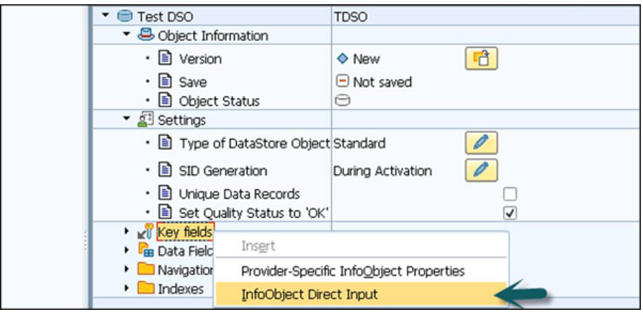 关键字段和数据字段-关键字段用于添加唯一记录。 要添加密钥字段,请右键单击“密钥”字段,然后选择“ InfoObject直接输入”。