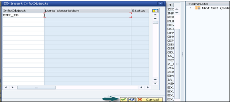 在新窗口中,在InfoObjects上输入技术名称,然后单击Continue。 您可以看到在关键字段部分下添加了InfoObject。