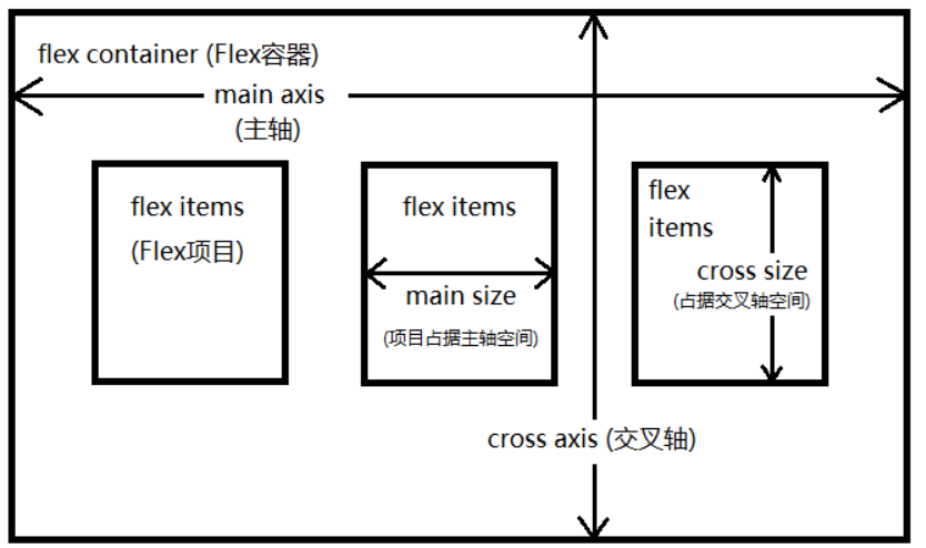 项目默认沿主轴排列。单个项目占据的主轴空间叫做main size,占据的交叉轴空间叫做cross size。