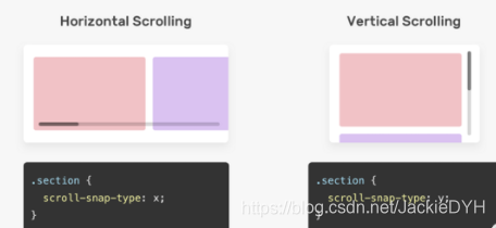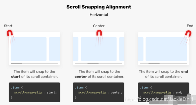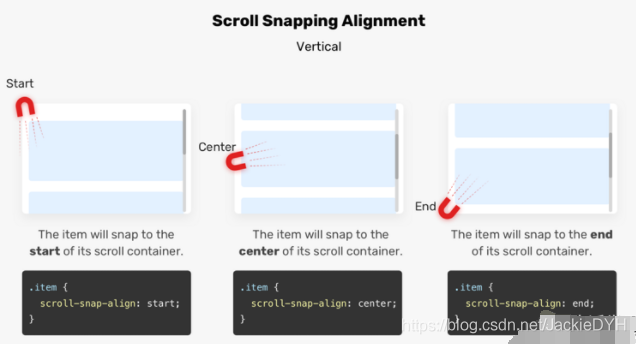 假设我们在滚动容器上有一块磁铁,这将有助于我们控制捕捉点。如果scroll-snap-type是垂直的,则对齐对齐将是垂直的。参见下图:
