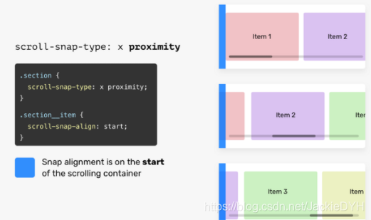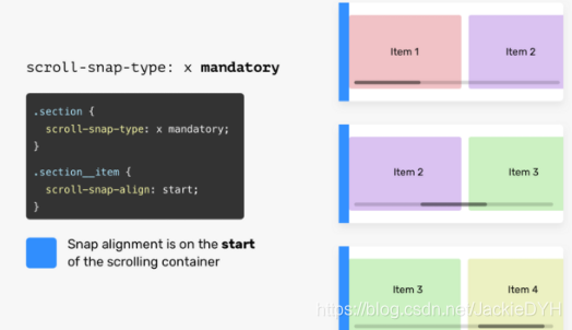 mandatory关键字意味着浏览器必须捕捉到每个滚动点。假设roll-snap-align属性有一个start值。这意味着,滚动必须对齐到滚动容器的开始处。