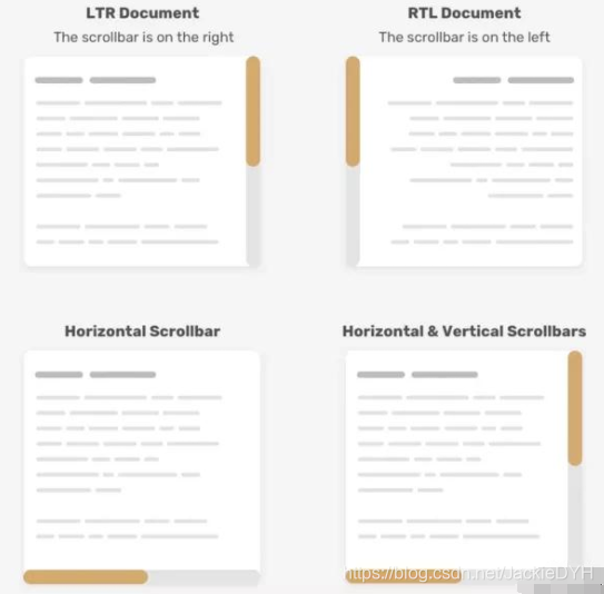 还有一件重要的事情要记住,滚动条可以水平或垂直地工作,这取决于设计。另外,在一个多语言网站上工作时,这一点也会发生变化,该网站在从左到右(LTR)和从右到左(RTL)两个方向上工作