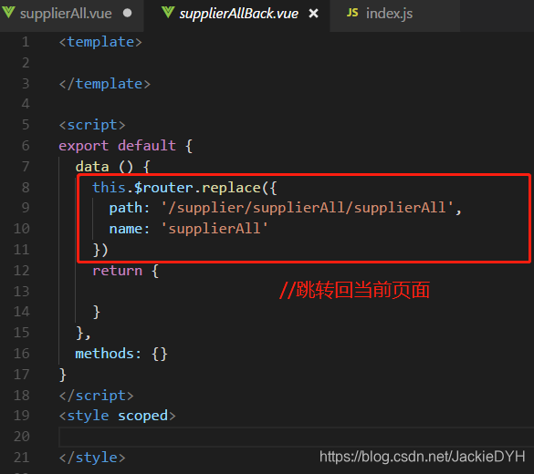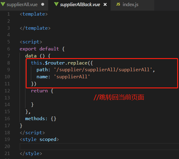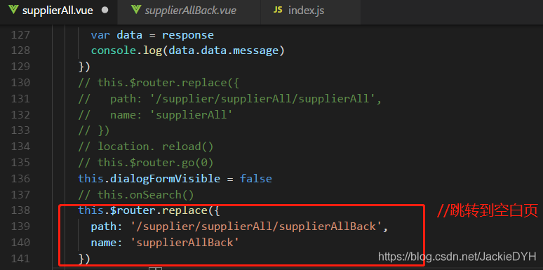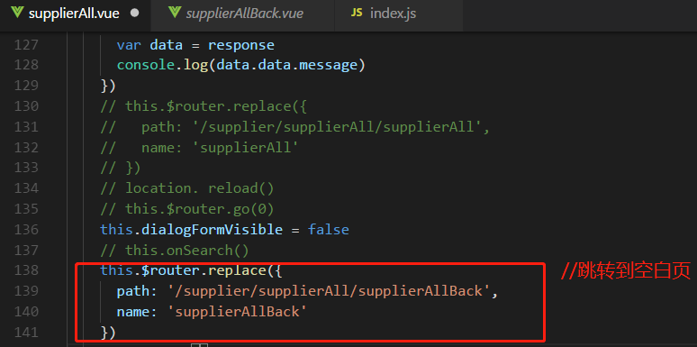 新建一个空白页面supplierAllBack.vue,点击确定的时候先跳转到这个空白页,然后再立马跳转回来