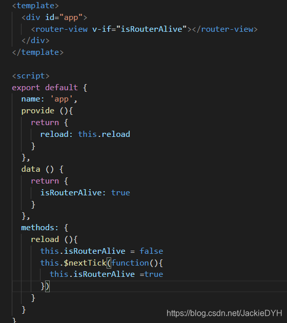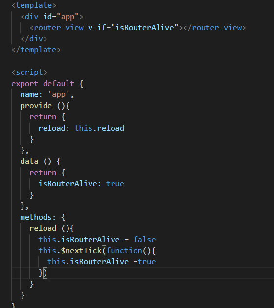 通过声明reload方法,控制router-view的显示或隐藏,从而控制页面的再次加载,这边定义了