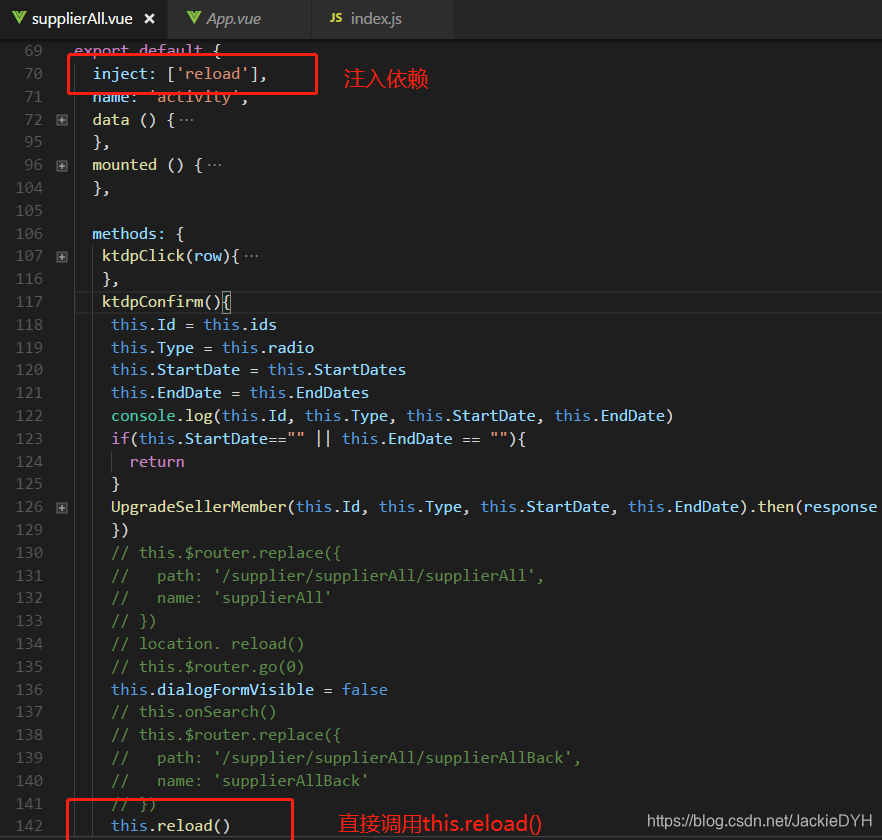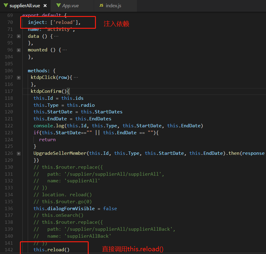 然后在需要当前页面刷新的页面中注入App.vue组件提供(provide)的 reload 依赖,然后直接用this.reload来调用就行