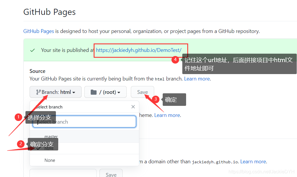 找到github pages那一栏,在Source中选择master 分支,然后save