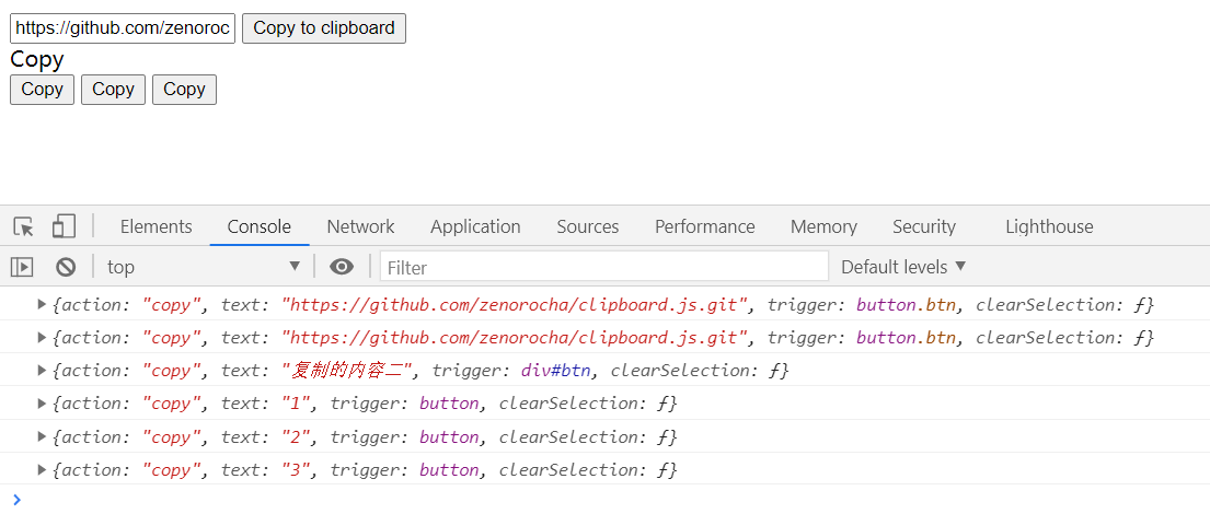 <div id="btn" data-clipboard-text="复制的内容二">