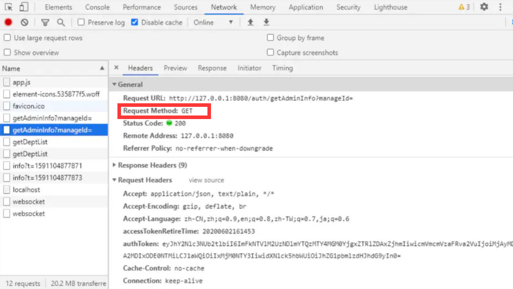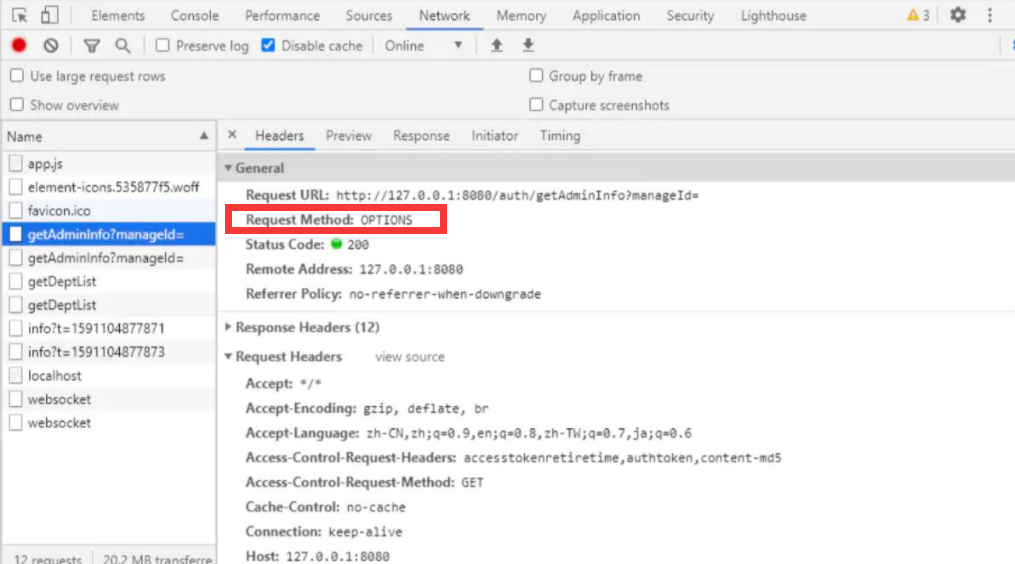在控制台开启 Disable cache ,可以看到请求中还有 OPTIONS ,关闭 Disable cache 之后,再看请求已经没有了 OPTIONS