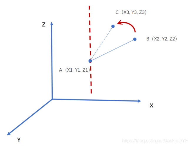X Y Z 是三维坐标系。线段 A B 保持 A 点不动,围绕 Z 轴方向 (红色虚线示意