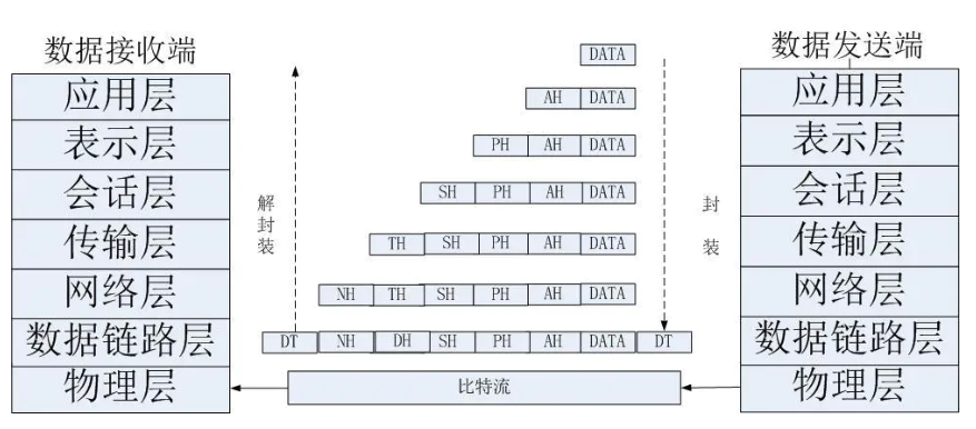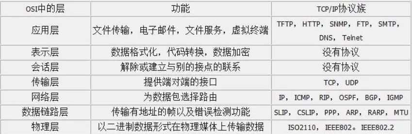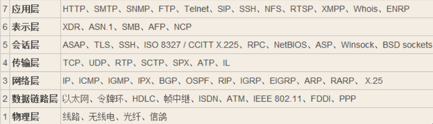 下面的图表试图显示不同的TCP/IP和其他的协议在最初OSI(Open System Interconnect)模型中的位置: