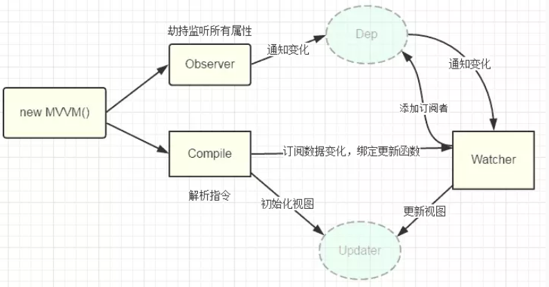 实现mvvm的双向绑定,是采用数据劫持结合发布者-订阅者模式的方式,通过Object.defineProperty()来劫持各个属性的setter,getter,在数据变动时发布消息给订阅者,触发相应的监听回调。就必须要实现以下几点: