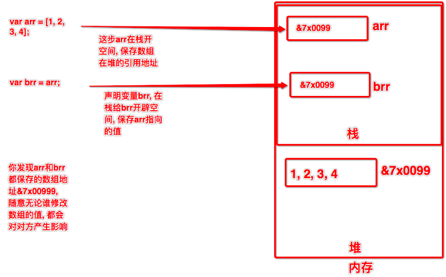 arr 和 brr变量中装载的是数组的内存地址&7x0099(编的地址), 改变数组内容都是在改变这个连续地址中的&7x0099内的值, 所以他俩都收到影响