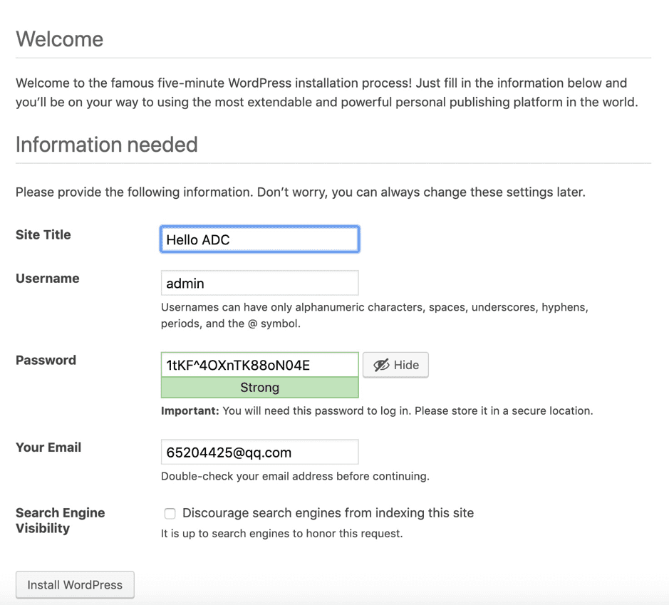 打开浏览器并访问http://xxx.xxx.xx.x/wp-blog/wp-admin/install.php ,其中 xxx.xxx.xx.x 为 ECS 实例的 弹性IP ,填写如下信息,完成后,点击页面底部的 安装WordPress ,开始部署 WordPress 。